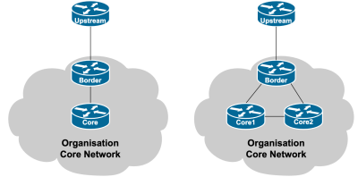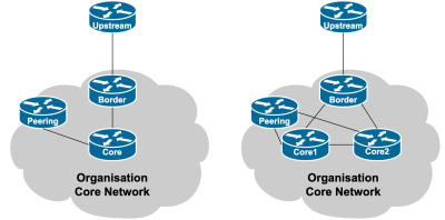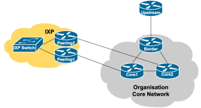 The main difference between the needs for a peering link and the Transit Connection discussed earlier is that the peering router will only ever carry the peer routes and internal routes of the organisation. In fullness of time, especially for network operators, and large enterprises, the transit router could quite likely end up carrying a large portion if not the entire BGP table, so will have to be sized accordingly. The peering router, on the other hand, can have a more modest memory (both RAM for the routing table and forwarding table) requirement.