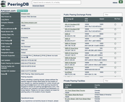 This one shows the Public peering and Private peering facilities AWS is present at. So a potential peer can check which locations they share with AWS, and then contact them about peering. The page for AWS contains data about number of prefixes, traffic ratios, etc, plus the IP addressing used at the various public Internet connect points. All this is designed to make it easier for prospective peers to assess and reach out to AWS for peering.
