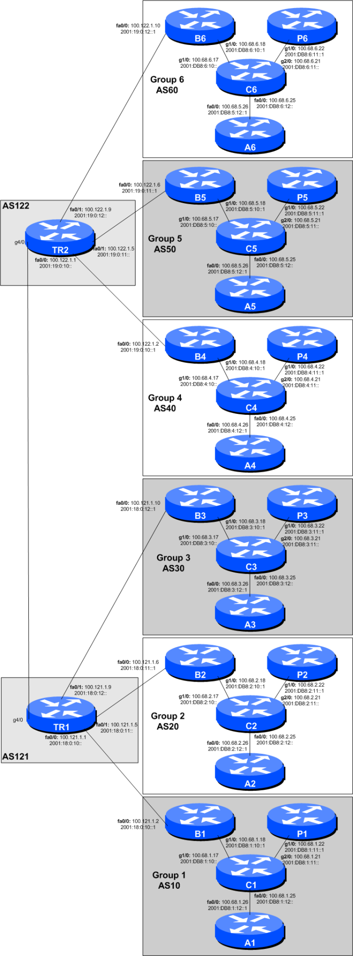 100.68.X.0/28 2001:DB8:X:0000::/64 Router loopbacks