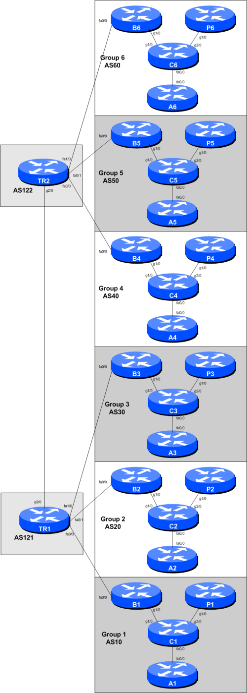 The initial lab topology sets up 6 autonomous systems, each with four routers. In each AS, one router is the border router (for connecting to transit providers), one router is the core router (representing the rest of the network operator’s core network), one router is a peering router (for connecting to private peers and IXPs), and one router is an access router (nominally where end users connect to the network).