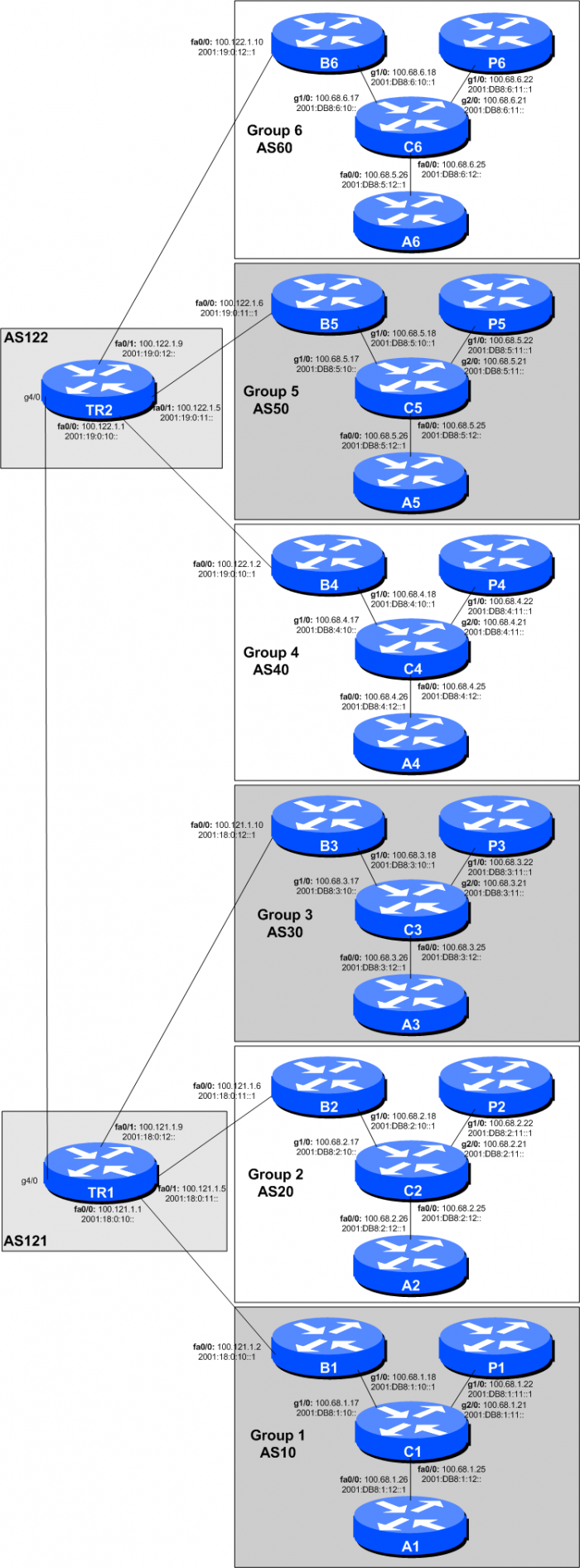 | 6 | 100.68.6.0/24 | 2001:DB8:6::/48 | 60 |