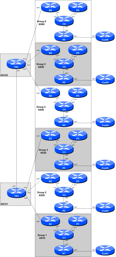 The lab has been set up to include a sample Customer router connected to the Access router for each Autonomous System. We will use this extended lab network to explore the different technologies. The lab topology is shown in the following diagram: