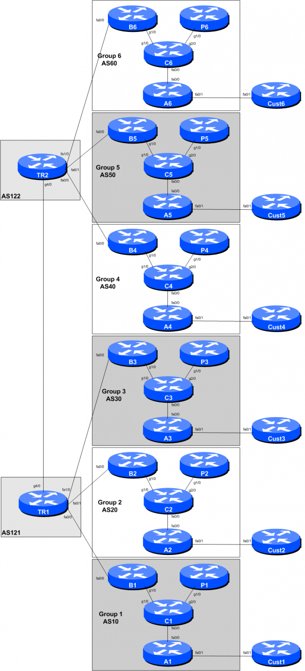 The lab has been set up to include a sample Customer router connected to the Access router for each Autonomous System. We will use this extended lab network to explore the different technologies. The lab topology is shown in the following diagram: